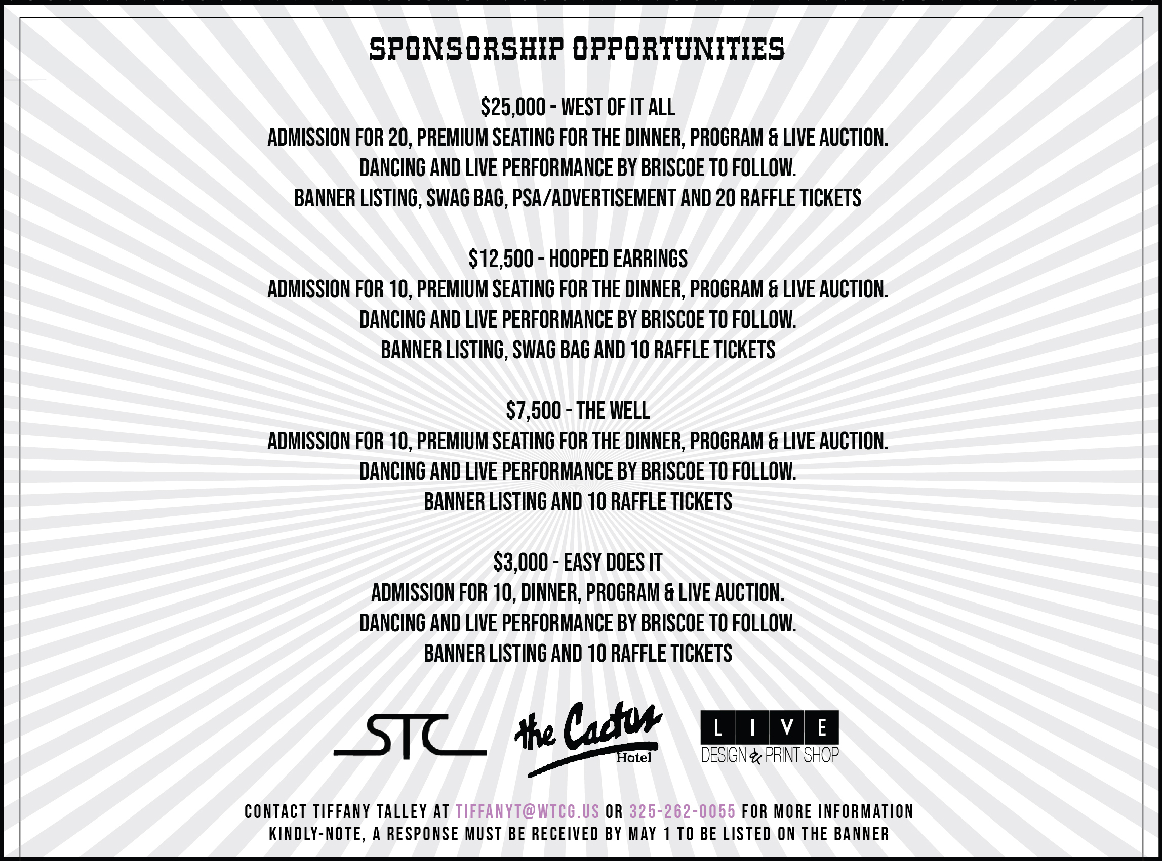 To purchase sponsorships, email tiffanyt@wtcg.us or call 325-262-0055.