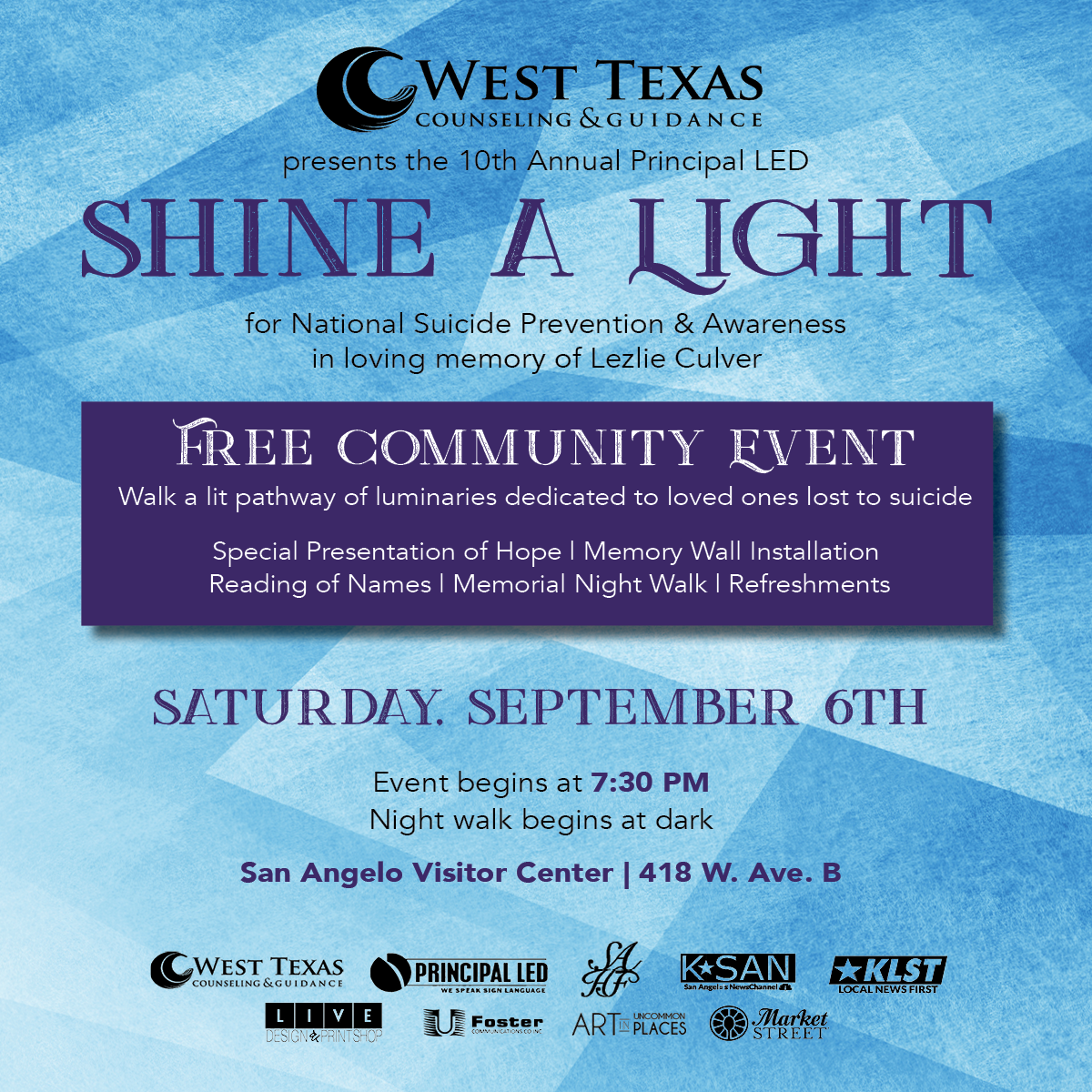 On Saturday, September 6, WTCG will host it’s 10th Annual Principal LED Shine a Light event at the Visitor’s Center downtown San Angelo. Beginning at 7:30 PM, this special evening will include a presentation of hope, memory wall art installation, reading of names and a memorial night walk along a luminary lit path at dusk.